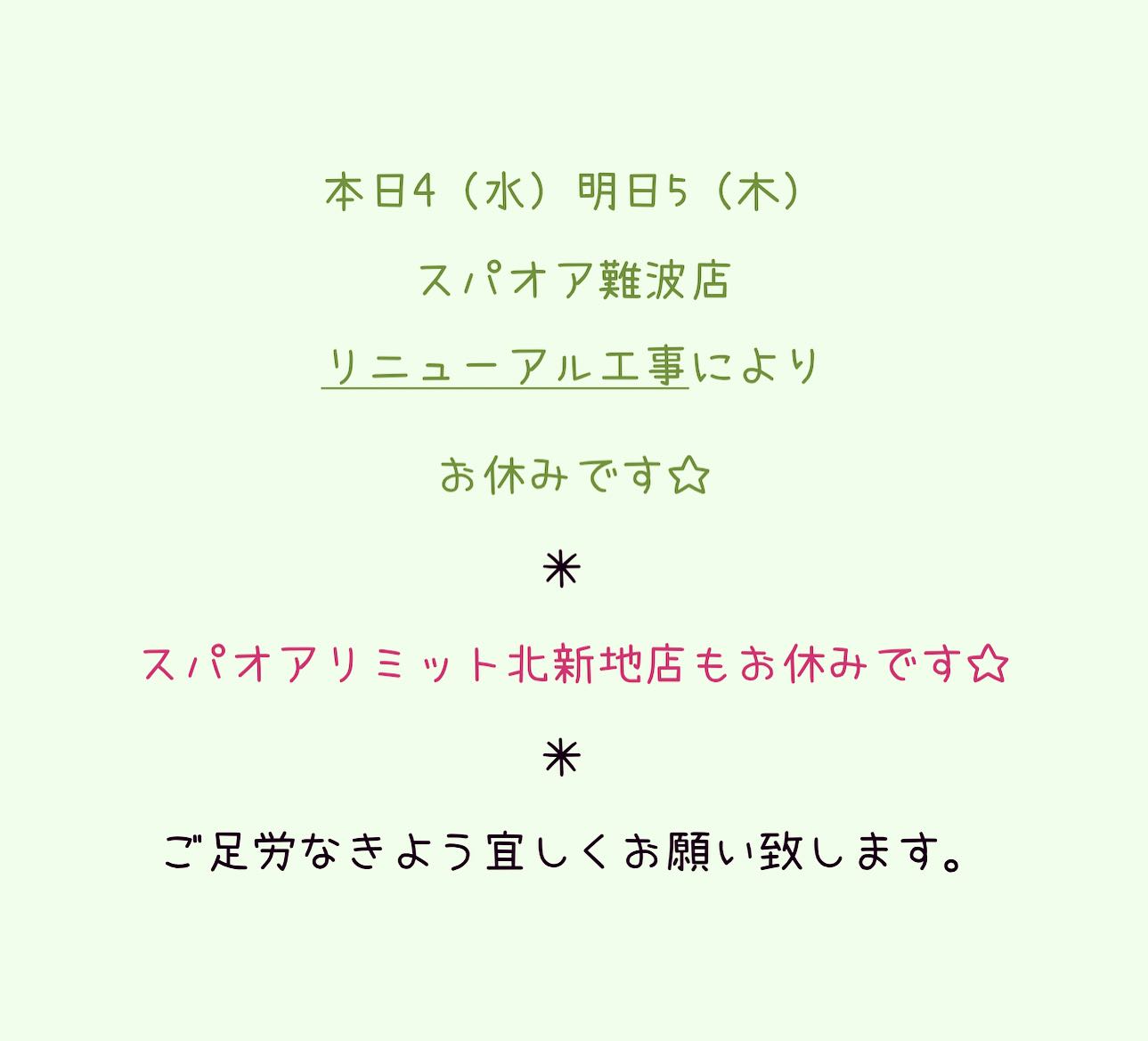 ☆ 本日4(水) 明日5(木) スパオア難波店 リニューアル工事により お休みです☆ ︎ スパオアリミット北新地店もお休みです☆ ︎ ご足労なきよう宜しくお願…