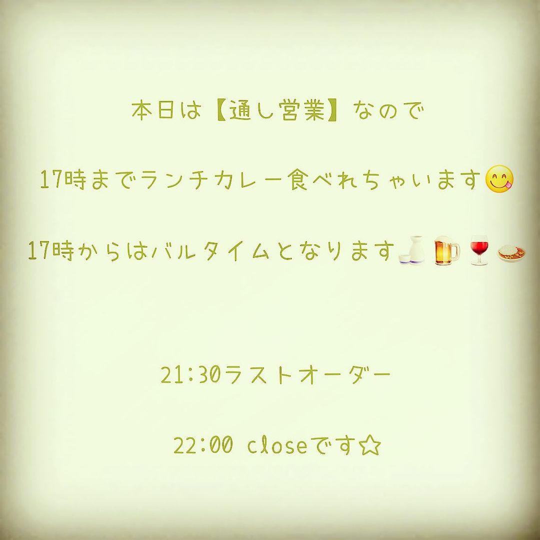 ︎ 本日は【通し営業】なので 17時までランチカレー食べれちゃいます 17時からはバルタイムとなります 21:30ラストオーダー 22:00 closeです☆…