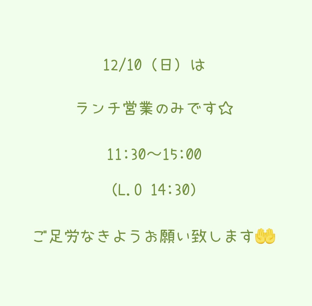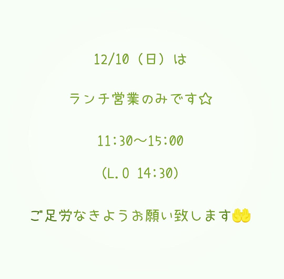 * 本日も沢山のご来店ありがとうございます❣️ 明日12/10(日)は ランチ営業のみ 〈11:30〜15:00 L.O14:30〉 となります! バルタイムはお休みですので、ご足労なきようお願いします🤲 〜〜〜〜〜〜〜… 続きを読む *