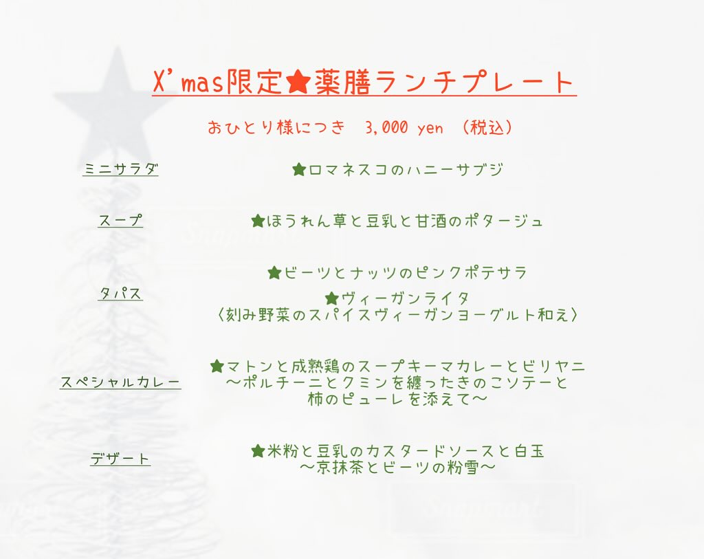 ✳︎ 12/20(金)〜25(水) 【X’mas限定⭐︎薬膳ランチプレート】 【X’mas限定★薬膳ディナーコース】 [全ての商品グルテンフリー&食品添加物無添加] ※おひとり様より 〈ご予約優先… 続きを読む ✳︎