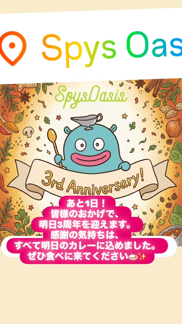 いよいよ明日。3回目の誕生日を迎えます。 このイラストのように、 たくさんのスパイスと、 そして何より、 皆様の温かい応援に囲まれた3年間でした。 ここまで続けてこられたのは、 「美味しかったよ」 「身体が軽くなったよ」… 続きを読む 3824107060044853575