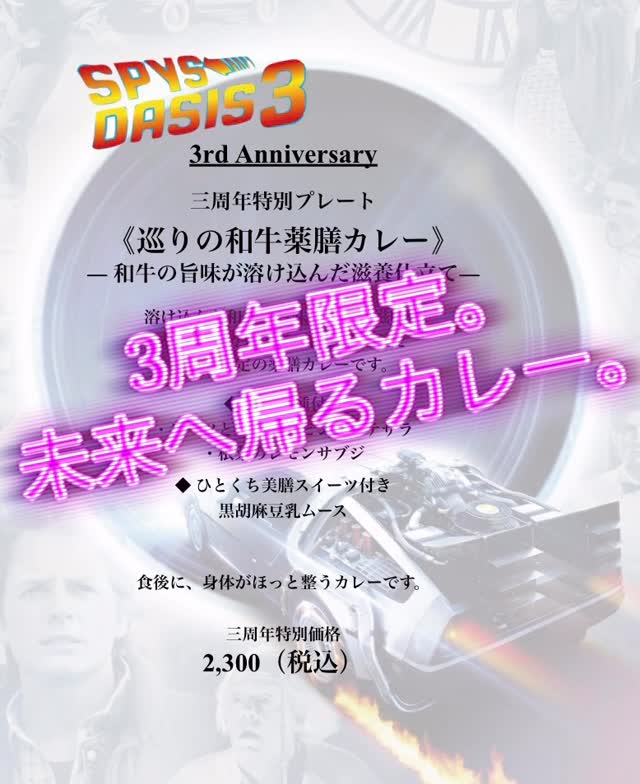 ⭐︎ 【3周年限定メニュー解禁】 未来へ帰る準備はできましたか? 🍛 3周年特別プレート 《巡りの和牛薬膳カレー》 ―和牛の旨味が溶け込んだ滋養仕立て― 溶け込んだ和牛の濃厚な旨味に、根菜の滋養、 そして「胡麻とカカオ」… 続きを読む 3827179876520666286